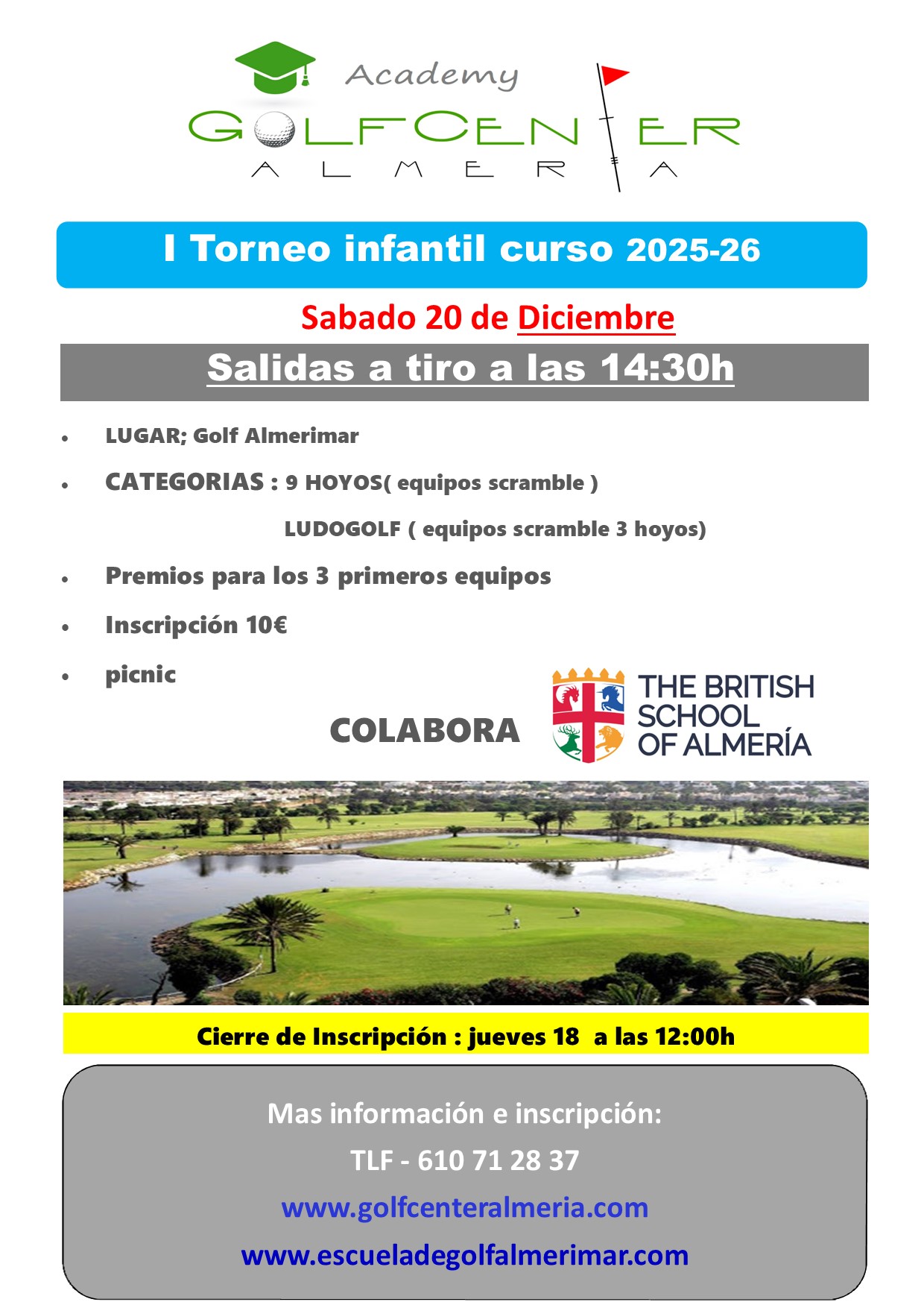 El sábado 20 de Diciembre los alumnos de nuestras escuelas de La Envia y de Almerimar jugaran en Golf Almerimar el 1º torneo del curso 2025-26, el horario sera para todos a las 14:30 con salida simultanea por todos los tees del recorrido blanco, en dos categorías, la principal a 9 hoyos y para los peques de ludogolf a 3 hoyos, la modalidad sera scramble por equipos. La inscripcion hay que realizarla directamente a los profes antes del jueves dia 18 de Diciembre y se paga el mismo dia antes de salir.
